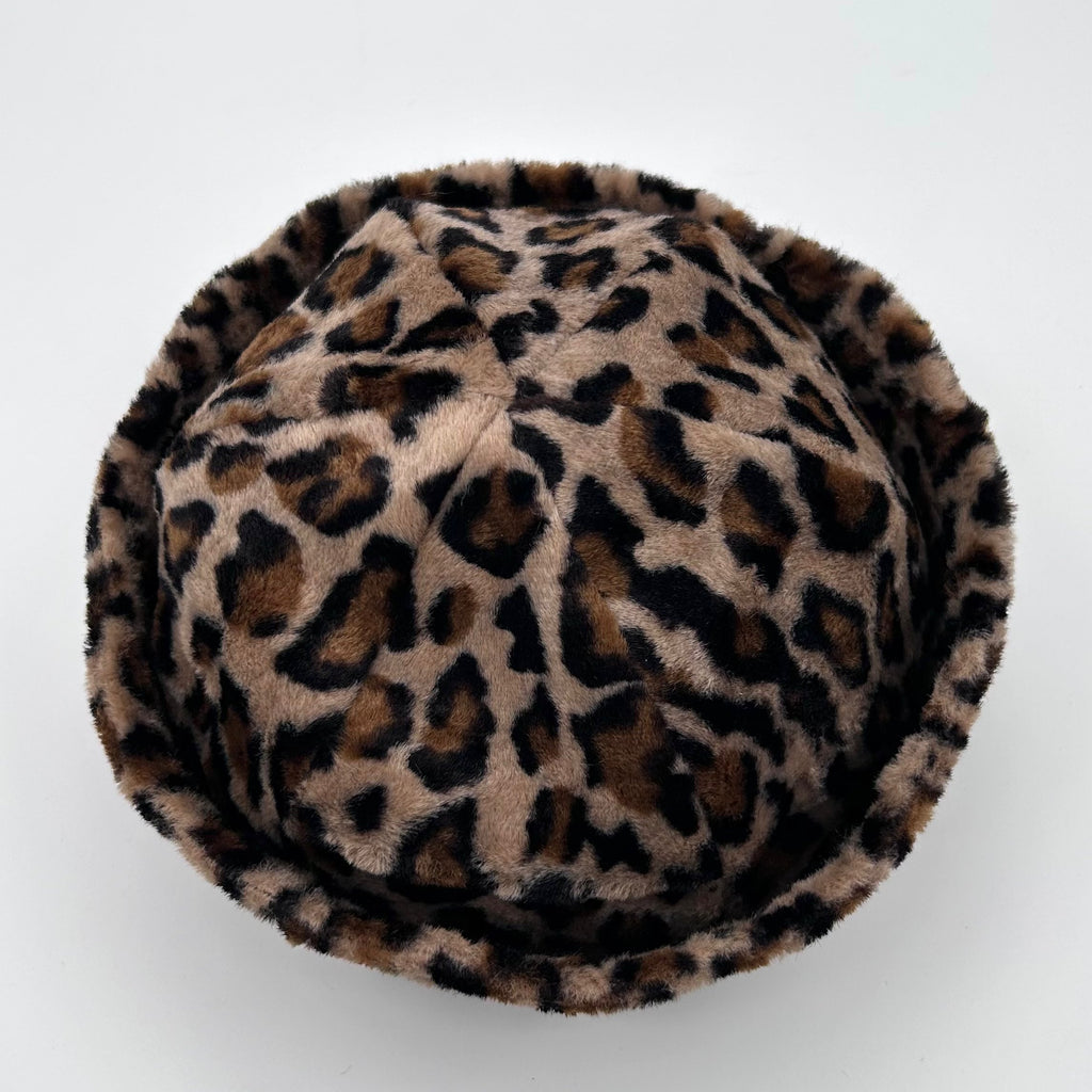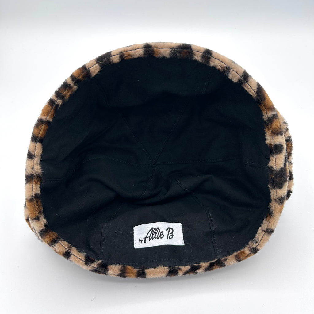 Upcycled 1/1 faux fur leopard print sailor hat made from a thrifted kids skirt with a black velvet ribbon trim and vintage black lining fabric.
