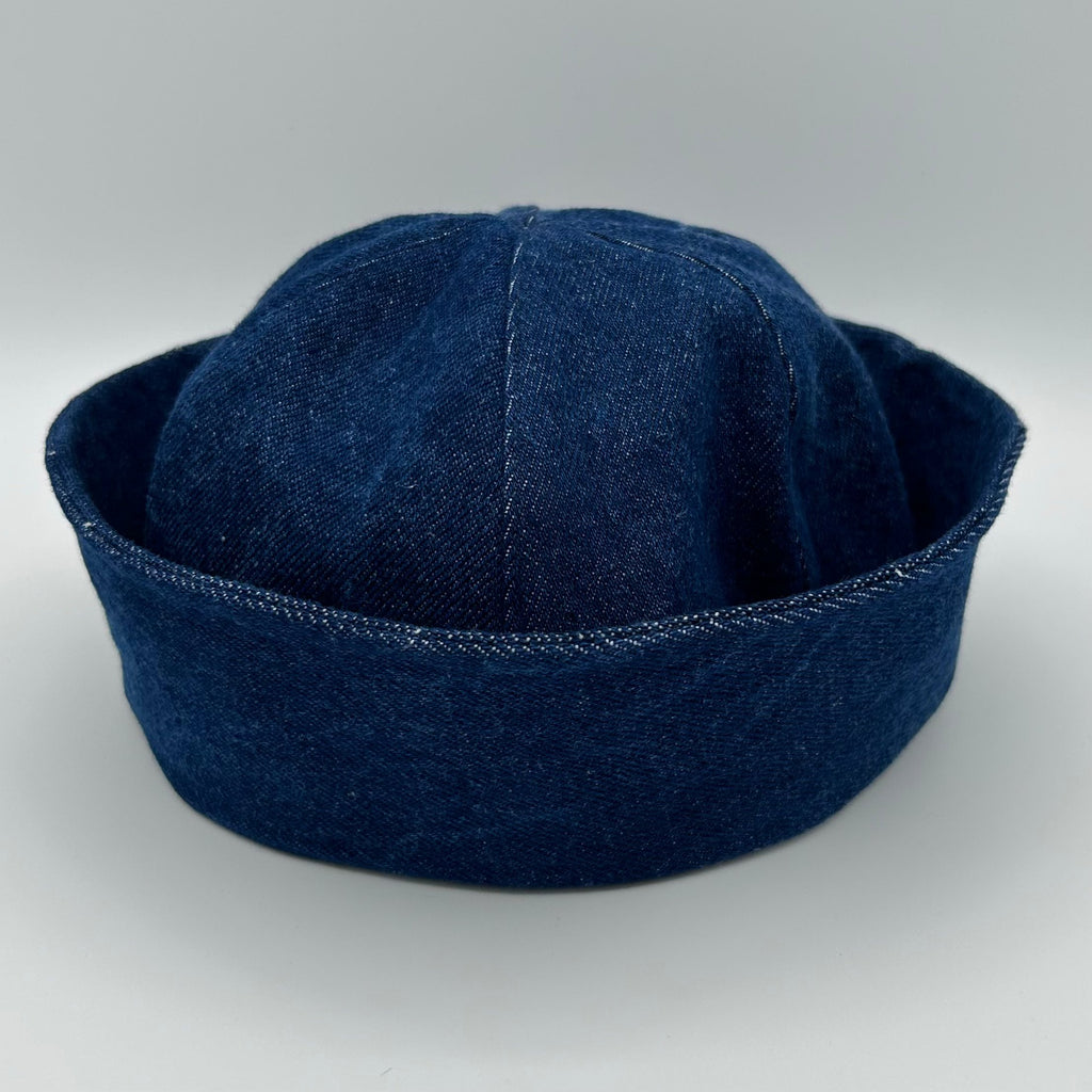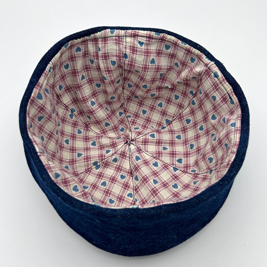 Made to Order upcycled dark wash denim sailor hat made from thrifted jeans with a vintage cotton heart print lining.